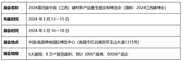 2024中国(江西)建材新产品暨全屋定制博览会,将于2024年3月16—18日在南昌绿地国际博览中心举办。预计展会规模80000㎡,将展出定制家居、门窗、全屋整装、顶/墙/地材/软装及灯饰、陶瓷/卫浴/石材、智能家居、暖通舒适家居/厨电、建筑新材料及装配式建筑等品类新产品、新材料、新工艺,同期将举办超过30场次的各类峰会、论坛、讲座等活动。预计参展企业将超过3000+、参会观众将达80000+人次。